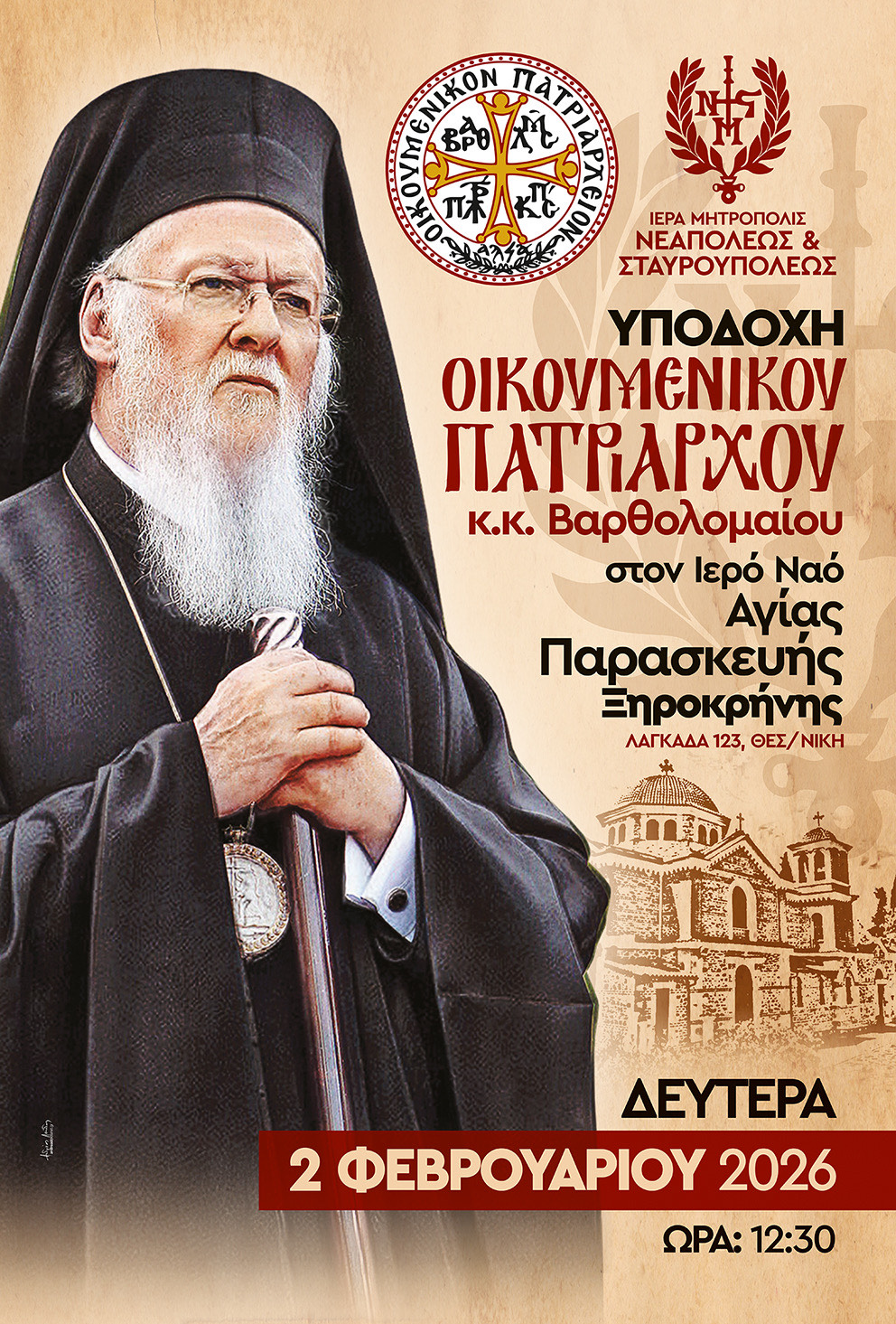 Υποδοχή Οικουμενικού Πατριάρχου στον Ιερό Ναό Αγίας Παρασκευής Ξηροκρήνης Δευτέρα 2 Φεβρουαρίου 2026 ώρα 12.30 μ.μ.